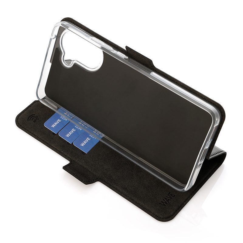 Wave Book Case on monipuolisilla ominaisuuksilla varustettu matkapuhelimen kannellinen suojakotelo, joka muotoilunsa ansiosta suojaa puhelinta kattavasti, lisäämättä kuitenkaan paljoa paksuutta puhelimen ympärille.