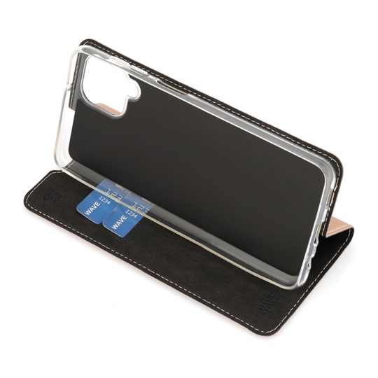 WAVE Book Case suojakotelo Samsung Galaxy A12 puhelimelle. Magneettisulkuinen kansi, korttipaikat RFID suojauksella ja läpinäkyvä muovikelkka (PC). Pintamateriaali laadukasta nahkaa.