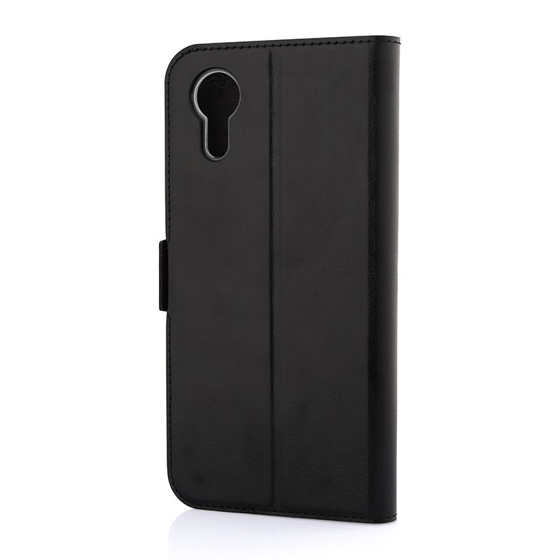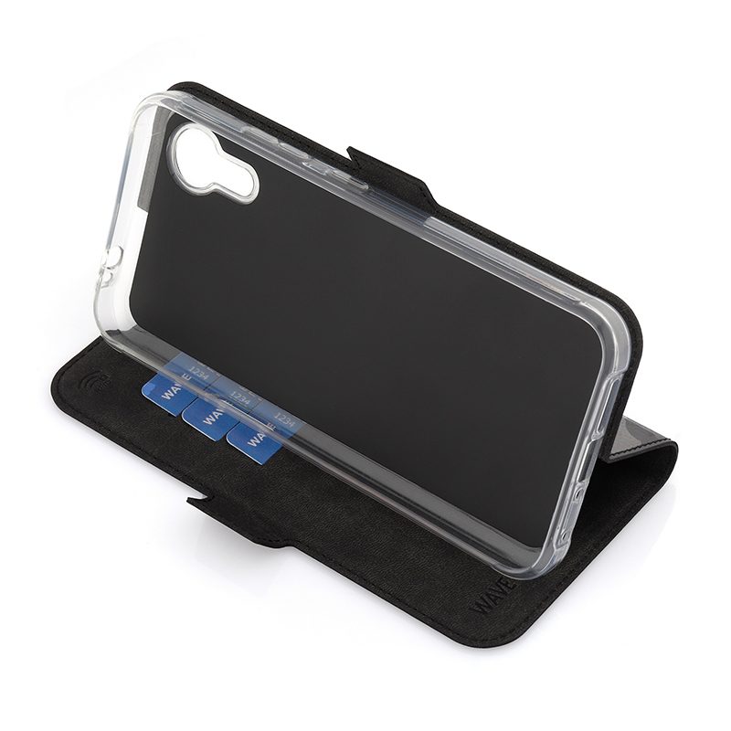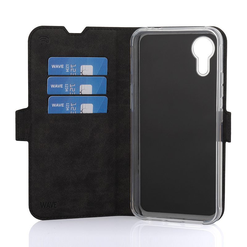Wave Book Case musta suojakotelo Samsung Galaxy Xcover 7 puhelimelle. Magneettisulkuinen kansi, korttipaikat RFID suojauksella ja läpinäkyvä muovikelkka (TPU). Pintamateriaali laadukasta nahkaa, jossa antimikrobipinnoite.