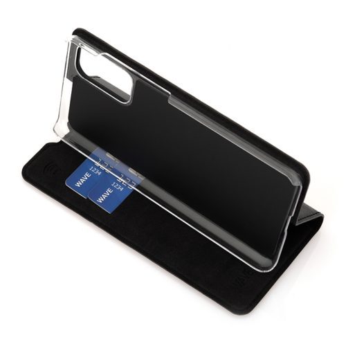 WAVE Book Case suojakotelo Samsung Galaxy S20 puhelimelle. Magneettisulkuinen kansi, korttipaikat RFID suojauksella ja läpinäkyvä muovikelkka (PC). Pintamateriaali laadukasta nahkaa.