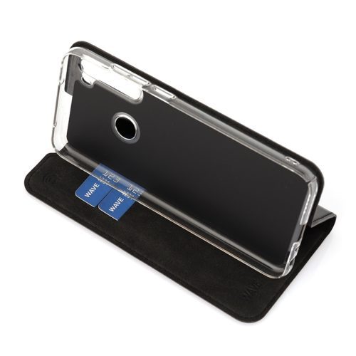 Wave Book Case suojakotelo Xiaomi Redmi Note 8T puhelimelle. Magneettisulkuinen kansi, korttipaikat RFID suojauksella ja läpinäkyvä muovikelkka (PC). Pintamateriaali laadukasta nahkaa.