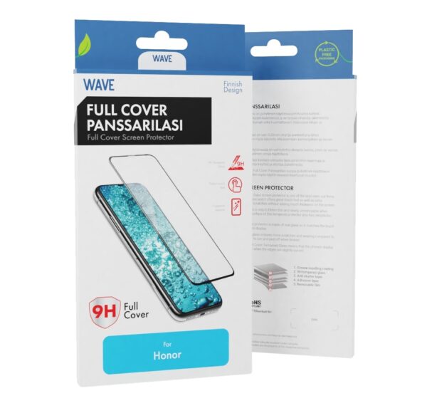 Wave Full Cover Panssarilasi Honor X6b puhelimille. Koko näytön peittävä lasikalvo mustalla kehyksellä. Näytönsuoja on valmistettu 9H kestävästä ja 0,33mm ohuesta lasista. Pakkauksessa yksi lasi ja puhdistusvälineet.