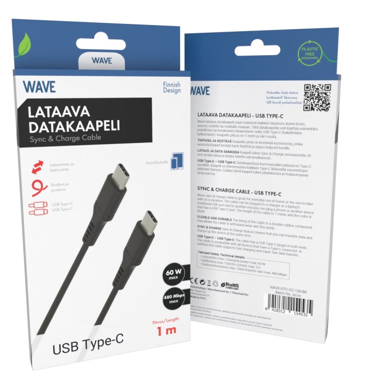Latausjohdon kummassakin päässä on USB Type-C urosliitin. Kaapeli on yhteensopiva kaikkien USB Type-C -liitännällä varustettujen laitteiden kanssa. Lisäksi tämä latauskaapeli tukee pikalatausta ja huippunopeaa tiedonsiirtoa.